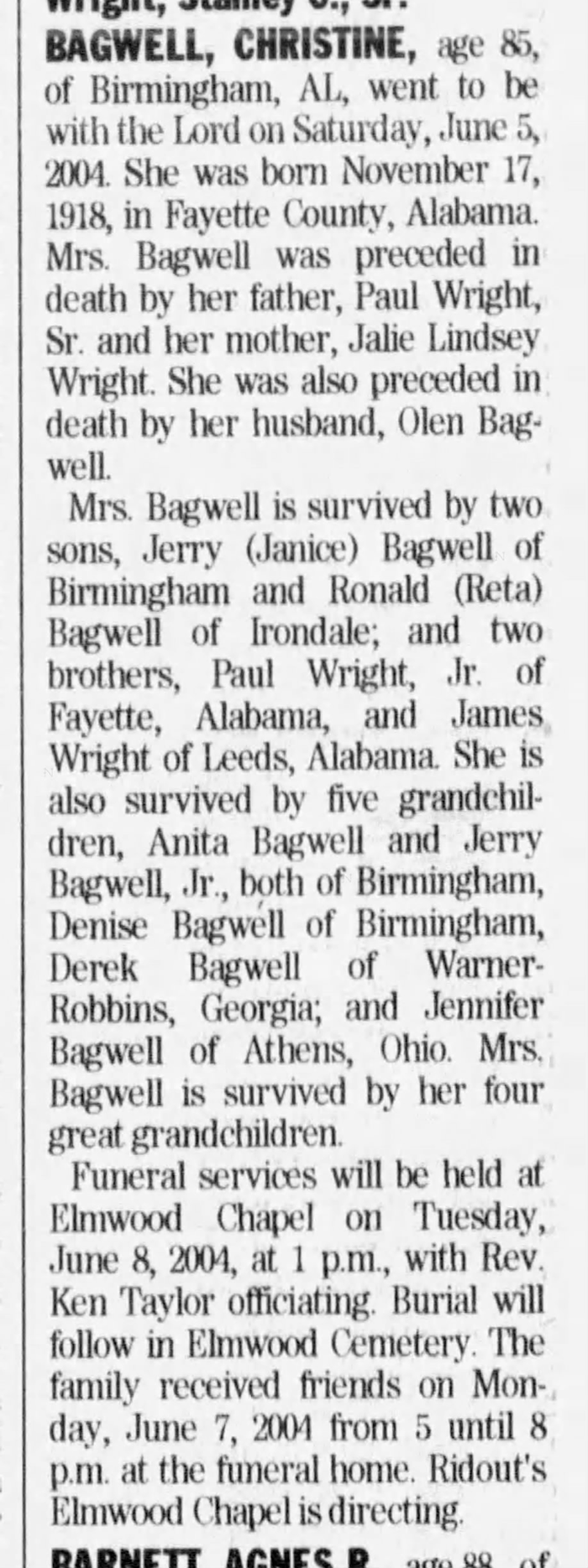 Christine Wright was born on 17 November 1918 in Fayette County, Alabama. As of 2 September 1941,her married name was Bagwell. She married Olen C. Bagwell, son of Jackson Randolph Bagwell and Lonia Edetta Dunn, on 2 September 1941. Christine Wright died on 5 June 2004 in Birmingham, Alabama, at age 85. She was buried on 8 June 2004 at Elmwood Cemtery, Birmingham, Jefferson County, Alabama.