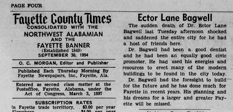 Dr. Ector Lane Bagwell DDS was born on 26 July 1918. He was the son of Ector Arnith Bagwell and Leona Velma Moore. Dr. Ector Lane Bagwell DDS died on 28 September 1954 at age 36. He was buried at Fayette City Cemetery, Fayette, Fayette County, Alabama.