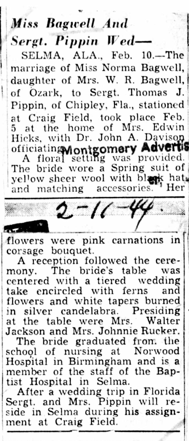Norma Louise Bagwell and Thomas J. Pippin - Marriage Annoucement