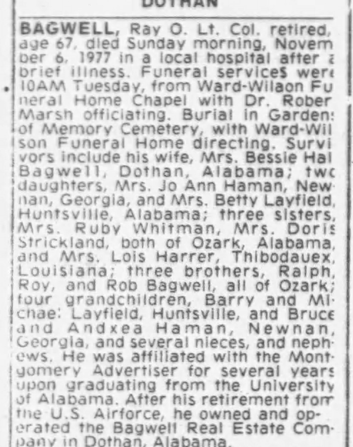 Lt. Col. Raiford Oscar Bagwell was also known as Ray Oscar Bagwell. He was born on 28 February 1911 in Dale County, Alabama. He was the son of William Riley Bagwell and Mamie Floyd Beasley. Lt. Col. Raiford Oscar Bagwell married Bessie Mae Hall on 27 December 1935 at Greenwood, South Carolina. He was a Lt. Colonel in the US Army Air Corps / Air Force during World War II and Korea. Lt. Col. Raiford Oscar Bagwell was buried on 6 November 1977 at Gardens of Memory, Kinsey, Houston County, Alabama.1 He died on 6 November 1977 in Kinsey, Houston County, Alabama, at age 66.1