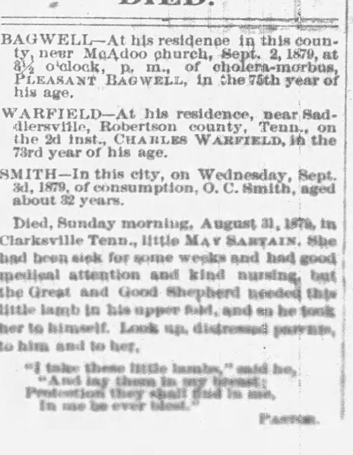 Major Pleasant B. Bagwell was born on 31 March 1805 in Bedford, Bedford County, Virginia.1,2 He was the son of Drury Bagwell and Catherine Ware. Major Pleasant B. Bagwell married Nancy Morrow on 28 September 1826.3 Major Pleasant B. Bagwell died on 2 September 1879 in Montgomery County, Tennessee, at age 74 of cholera-morbus.1,2 He was buried at Bagwell Cemetery, Clarksville, Montgomery County, Tennessee.1,2