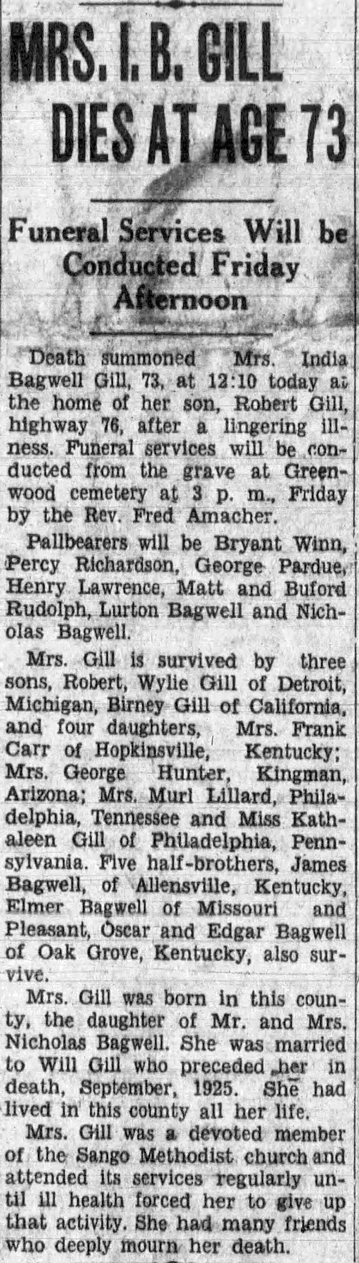 Mary "India" (Bagwell) Gill was born on January 23, 1862 in Montgomery County, Tennessee, the daughter of Nicholas Eubanks Bagwell and Elizabeth Caroline "Lizzie" Burney.