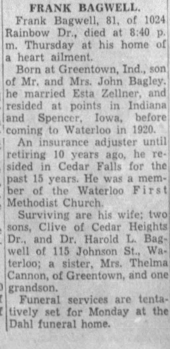 Frank Staley Bagwell was also known as Staley Franklin Bagwell. He was born on 8 September 1880 in Greentown, Indiana.1 He was the son of John William Bagwell and Sarah Ellen Carr.1 Frank Staley Bagwell married Esta Belle Zellner on 9 November 1902 at Greentown, Howard County, Indiana. Frank Staley Bagwell and Esta Belle Zellner lived on 12 September 1918 in Spencer, Clay County, Iowa. Frank Staley Bagwell lived in 1938 in Waterloo, Iowa.2 He died on 3 August 1961 in Cedar Falls, Black Hawk County, Iowa, at age 80. He was buried on 7 August 1961 at Greenwood Cemetery, Cedar Falls, Black Hawk County, Iowa.