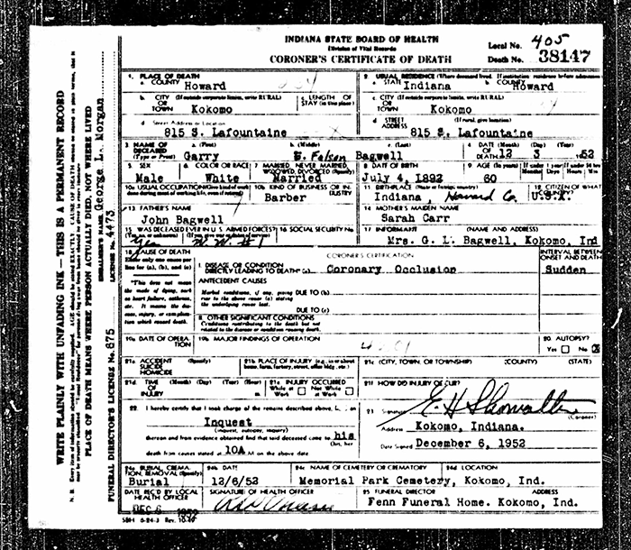 Garry Falson Bagwell was also known as Gary Falsom Bagwell. He was born on 4 July 1892 in Greentown, Howard County, Indiana.1,2 He was the son of John William Bagwell and Sarah Ellen Carr.1 Oleith or Kevin Bagwell's father is listed as Gary Bagwell on the birth certificate and Scott Bagwell on the death certificate. He was sent in the draft of Aug. 25, 1918, to Purdue University, and was transferred from that training school Oct. 27, 1918, to the ordnance section at Camp Hancock, Ga; then on Dec. 22 he was sent to Port Clinton Ohio, and assigned to Co. D, Erie Proving Grounds, and for a time before his discharge, July 31, 1919, he served in the military police. Garry Falson Bagwell married Mary Elizabeth Lorenz on 11 September 1924. Garry Falson Bagwell died on 3 December 1952 in Howard County, Indiana, at age 60