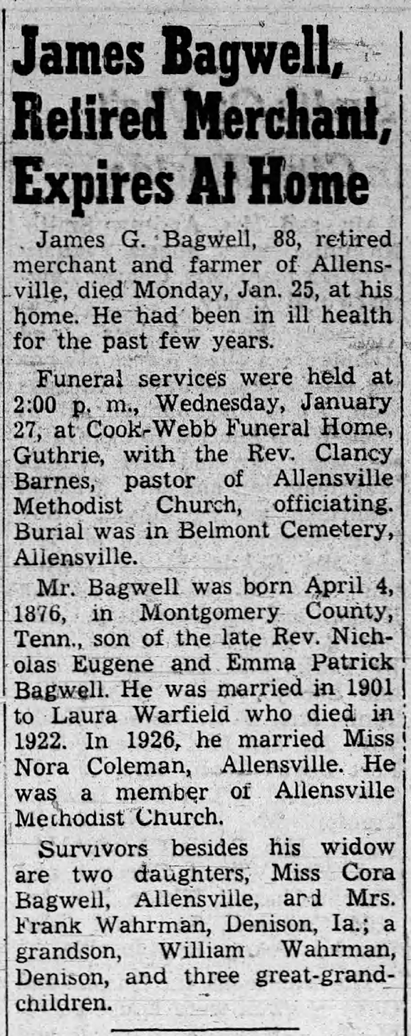 Mr. Bagwell was born April 4, 1876, in Montgomery County, Tenn., son of the late Rev. Nicholas Eugene and Emma Patrick Bagwell. He was married in 1901 to Laura Warfield who died in 1922. In 1926, he married Miss Nora Coleman, Allensville. He was a member of Allensville Methodist Church.