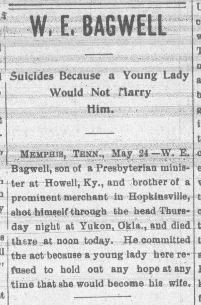 Walter Eugene Bagwell was born on 3 December 1881. He was the son of Reverend Nicholas Eubanks Bagwell and Emaline Emma Patrick. Walter Eugene Bagwell died on 22 May 1902 in Yukon, Canadian County, Oklahoma, at age 20 committed suicide by shooting himself. He was buried at Flat Lick Cumberland Presbyterian Church Cemetery, Herndon, Christian County, Kentucky.1