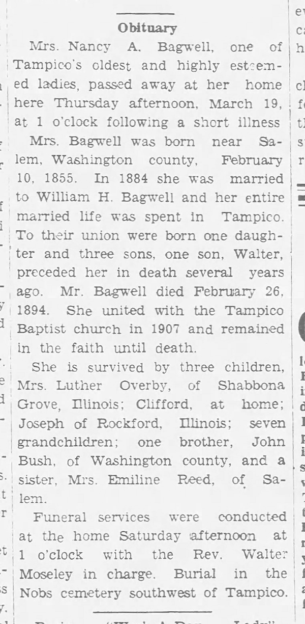 - [S703] Nancy A Bush Bagwell Grave Stone, Find a Grave, www.findagrave.com, http://www.findagrave.com/cgi-bin/fg.cgi