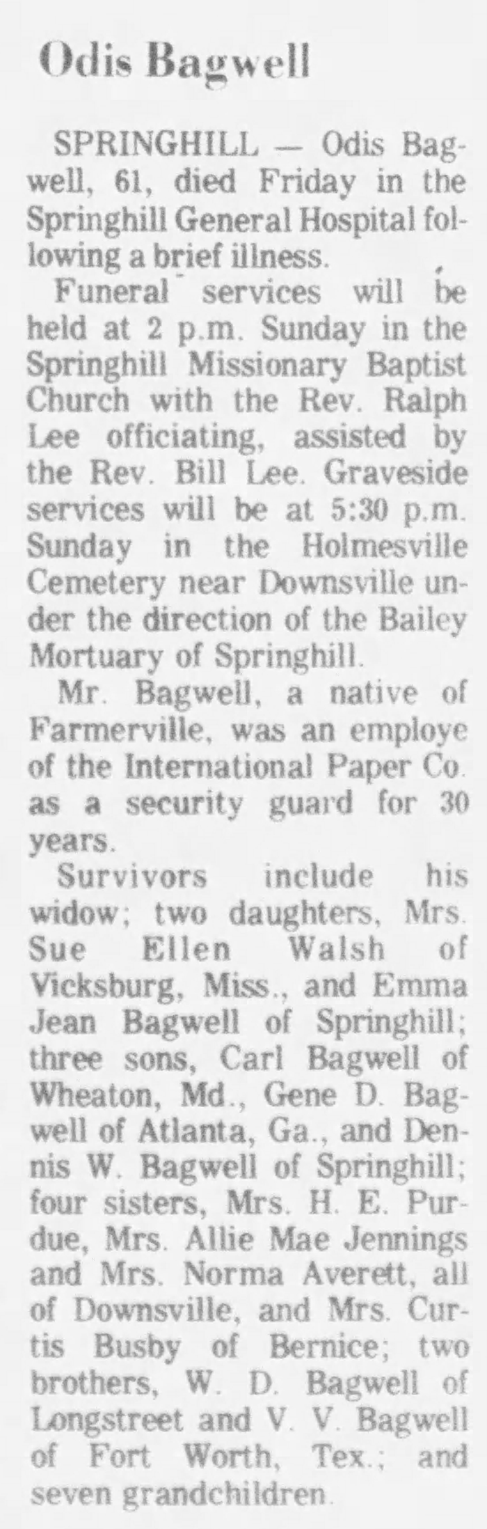 Odis Thomas Bagwell was also known as Otis Bagwell.1 He was born on 29 September 1912 in Union Parish, Louisiana.1 He was the son of Delaney Hicks Bagwell and Lula M. Skains. Odis Thomas Bagwell married Alice Lorene Montgomery before 1933. Odis Thomas Bagwell married Catherine Emma Day on 30 January 1933. Odis Thomas Bagwell died on 6 September 1974 in Springhill, Union Parish, Louisiana, at age 61.1 He was buried at Holmesville Cemetery, Union Parish, Louisiana.1