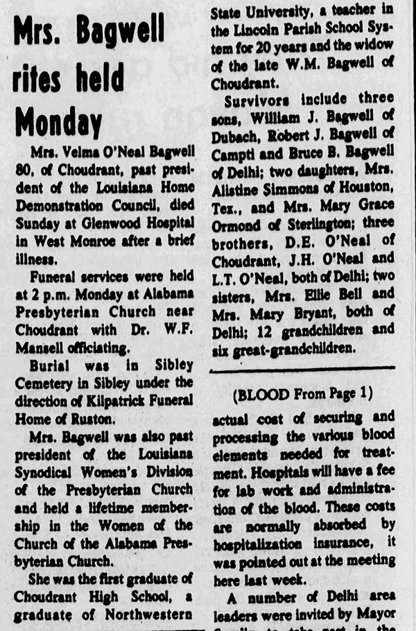 Carrie Velma O'Neal was born on 6 August 1896.1 She married William Mallory Bagwell, son of Andrew Jackson Bagwell Jr. and Emma Harriett Gentry, after 1910.1,2 As of after 1910,her married name was Bagwell. Carrie Velma O'Neal died on 7 November 1976 in Glenwood Hospital, West Monroe, Louisiana, at age 80.1 She was buried on 15 November 1976 at Sibley Cemetery, Sibley, Louisiana.