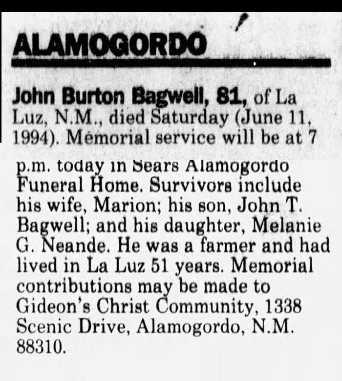 John Burton Bagwell was also known as J. B. Bagwell. He was born on 19 June 1912 in Marathon, Brewster County, Texas. He was the son of Oscar Judson Bagwell and Mary Saphronia Cope. John Burton Bagwell married Marion L. Abbott circa 1933. John Burton Bagwell died on 11 June 1994 in La Luz, Otero County, New Mexico, at age 81.