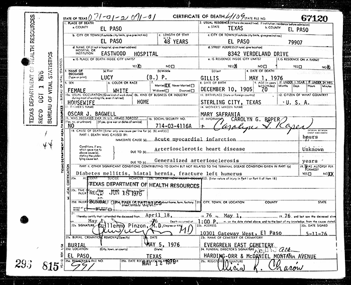 Lucy Preshea Bagwell was born on 10 December 1905 in Sterling City, Texas. She was the daughter of Oscar Judson Bagwell and Mary Saphronia Cope. As of 31 December 1926,her married name was Gillis. Lucy Preshea Bagwell married Carlos Edward Gillis on 31 December 1926 at El Paso, Texas. Lucy Preshea Bagwell died on 1 May 1976 in El Paso, El Paso County, Texas, at age 70. She was buried on 11 May 1976 at Evergreen East Cemetery, El Paso, Texas.