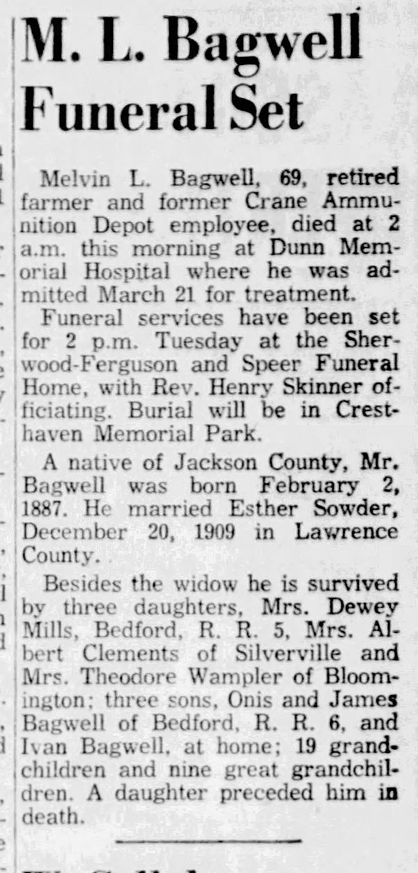 Melvin Llary Bagwell was also known as Milburn Bagwell.1 He was born on 2 February 1887 in Heltonville, Lawrence County, Indiana. The 1900 Census lists his birth year as Feb 1888.1,3,2,4,5 He was the son of James A. Bagwell. James Allen Bagwell was Melvin Llary Bagwell's foster-father. At this time. I can't determine from James Allen Bagwell's brothers or sisters as to whom his biological parents were. He was in James' home as early as 1900 and listed in James' obituary as his foster-son when other nephews and neices were not named. Melvin Llary Bagwell lived in 1900 in Owen, Jackson County, Indiana, in the household of James Bagwell. Melvin Llary is listed as James Bagwell's nephew..1 He married Bessie Sutton on 17 May 1906 at Jackson County, Indiana.2 Melvin Llary Bagwell married Esther M. Sowder on 20 December 1909 at Lawrence County, Indiana.2,5 Melvin Llary Bagwell lived in 1910 in Pleasant Run, Lawrence County, Indiana.2 He lived in 1917 in Bedford, Lawrence County, Indiana.3 He and Esther M. Sowder lived in 1930 in Pleasant Run, Lawrence County, Indiana.5 Melvin Llary Bagwell lived on 27 April 1942 in Bedford, Lawrence County, Indiana.4 He was (an unknown value) on 27 April 1942 at Leland Goodman Englewood, Burns City, Martin County, Indiana.4 He died on 26 March 1956 in Dunn Memorial Hosptial, Bedford, Indiana, at age 69. He was buried on 27 March 1956 at Cresthaven Memorial Park, Bedford, Lawrence County, Indiana.