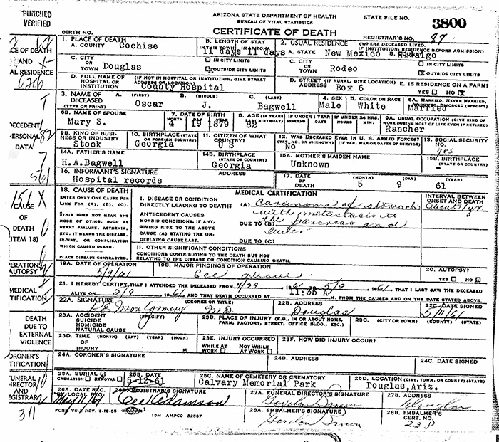 Oscar Judson Bagwell was born on 19 April 1879 in Rome, Floyd County, Georgia.1 He was the son of Huey Artemus Bagwell and Lula Lucy Saxon. Oscar Judson Bagwell married Mary Saphronia Cope on 19 January 1900 at Sterling City, Sterling County, Texas. Oscar Judson Bagwell died on 8 May 1961 in Douglas, Cochise County, Arizona, at age 82 of stomach cancer that had metastasis to the pancreas and liver.1 He was buried on 12 May 1961 at Calvary Memorial Park, Douglas, Cochise County, Arizona.1