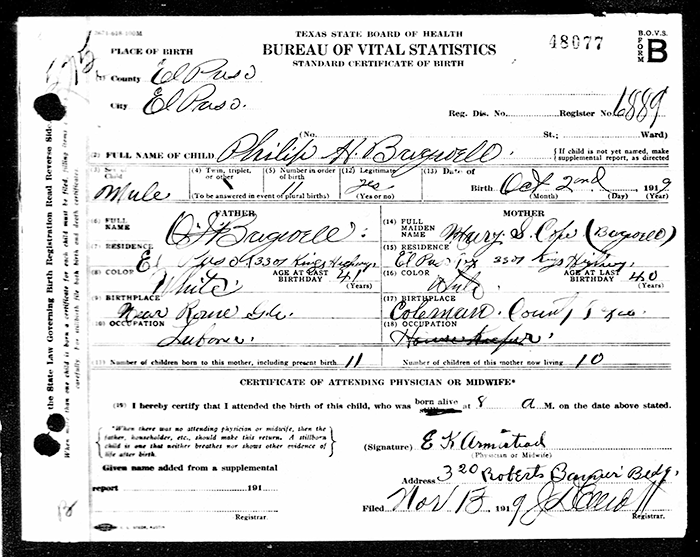 Captain Phillip H. Bagwell was born on 2 October 1919 in El Paso, Texas. He was the son of Oscar Judson Bagwell and Mary Saphronia Cope. Captain Phillip H. Bagwell married Francel Merle Ferguson in 1943. Captain Phillip H. Bagwell died on 15 June 2000 in Douglas, Cochise County, Arizona, at age 80.