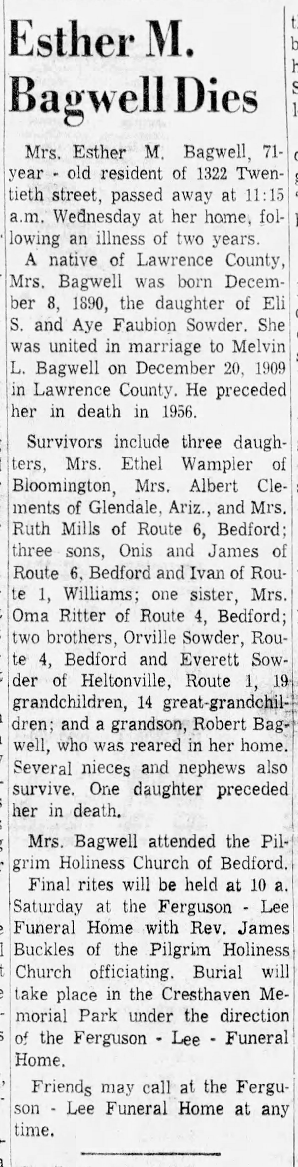 Esther M. Sowder was also known as Esta Sowder. She was born on 8 December 1890 in Lawrence County, Indiana.1 As of 20 December 1909,her married name was Bagwell. She married Melvin Llary Bagwell, son of James A. Bagwell, on 20 December 1909 at Lawrence County, Indiana.1,2 Esther M. Sowder and Melvin Llary Bagwell lived in 1930 in Pleasant Run, Lawrence County, Indiana.2 Esther M. Sowder died on 3 January 1962 in Bedford, Lawrence County, Indiana, at age 71. She was buried on 6 January 1962 at Cresthaven Memorial Park, Bedford, Lawrence County, Indiana.