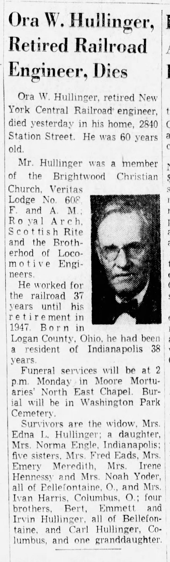 Ora William Hullinger was born on 23 December 1888 in Huntsville (Bellefontaine), Logan County, Ohio.1,2,3,4 He was the son of Jason Patrick Hullinger and Mary Ella Tudor.5,6 He worked as an engineer the New York Central Railroad. He worked for the railroad from from 1910 to 1947.4 Ora William Hullinger married Edna Lee Herring, daughter of James Hode Herring and Anna Josephine Harrod, on 18 September 1912 at Marion County, Indiana.1,7,3,4 Ora William Hullinger and Edna Lee Herring lived on 8 April 1930 in Indianapolis, Marion County, Indiana; Elizabeth Engle's family history book indicates that Ora Hullinger had the house built and she (Elizabeth Lee Engle) lived there.2,3,1 He was working for New York Central Railroad (Ohio Division) on 27 April 1942.2 Ora William Hullinger died on 9 June 1949 in Indianapolis, Marion County, Indiana, at age 60.1,4 He was buried on 13 June 1949 at Washington East (George Washington Cemetery), Indianapolis, Marion County, Indiana.1,4
