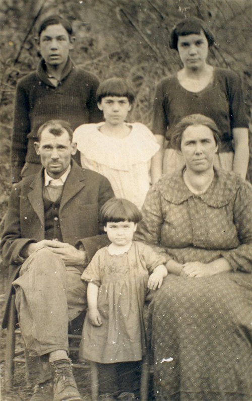 Front (Left to Right): Clara Belle (Bishop) Bagwell, Hiram Alex Bagwell Jr., Bobby Scott Bagwell Back (Left to Right): Reta Clarice Bagwell (baby on shoulders), Hiram Alex Bagwell, Jackie Gilmer Long