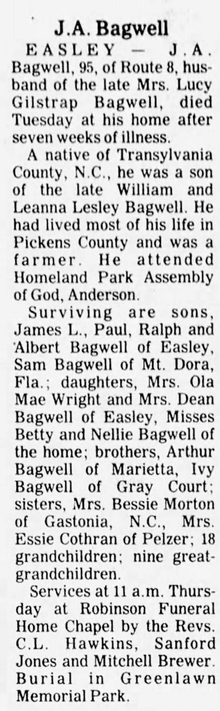 She was survived by her husband and son; three grandchildren; two sisters, Mrs. C.L. (Maybelle) Evans of Honea Path and Mrs. J.D. (Dessie) Taylor of Hodges; four brothers, M.C. Bagwell of Albany, Ga., Rev. W.S. Bagwell of Tallahassee, Fl., H.A. Bagwell of Atlanta, Ga., and L.G. Bagwell of Fayette, Ga.
