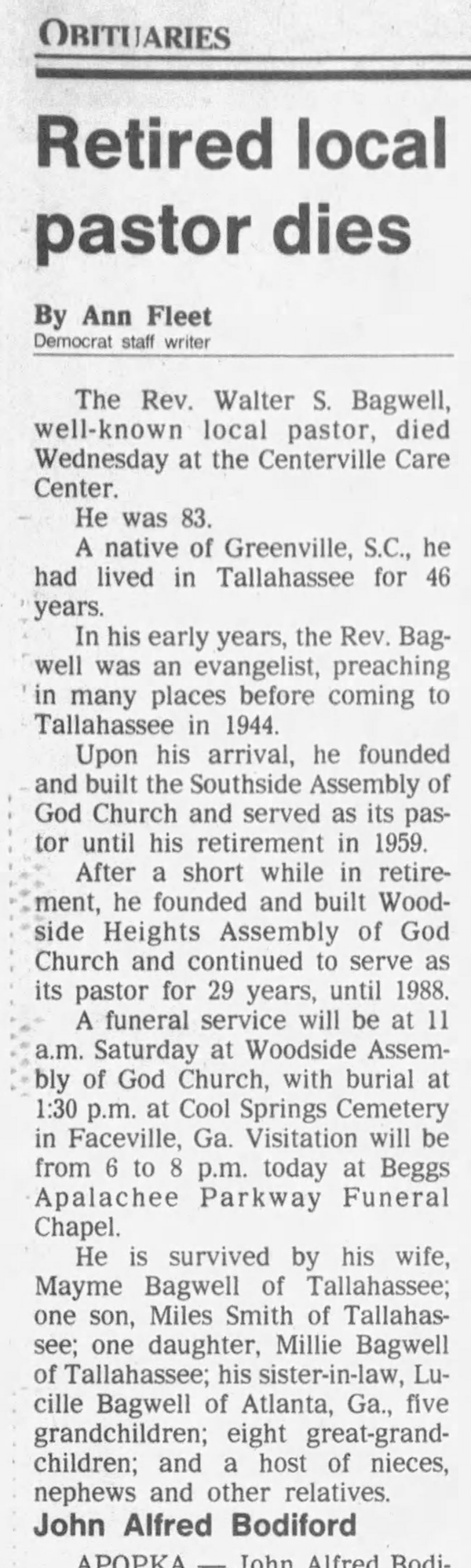 Reverend Walter Smith Bagwell was born on 6 October 1906 in Greenville County, South Carolina.1,2 He was the son of John Mansell Bagwell and Sarah Edna Moore.1 Reverend Walter Smith Bagwell married Aretta Marler before 1928. Reverend Walter Smith Bagwell married Mayme Laura Blount on 2 September 1933 at Danville, Virginia. Reverend Walter Smith Bagwell died on 22 August 1990 in Leon, Florida, at age 83.2 He was buried at Cool Springs Cemetery, Faceville, Decatur County, Georgia.2