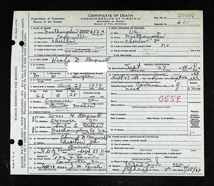 Inez Pearl Mapp was born in 1895 in Accomack County, Virginia. She married Leroy Lee Bagwell, son of William Healy Bagwell and Susan Elizabeth Watson, on 22 August 1917 at Northampton County, Virginia. As of 22 August 1917,her married name was Bagwell. Inez Pearl Mapp died in 1966. She was buried at Belle Haven Cemetery, Belle Haven, Virginia.