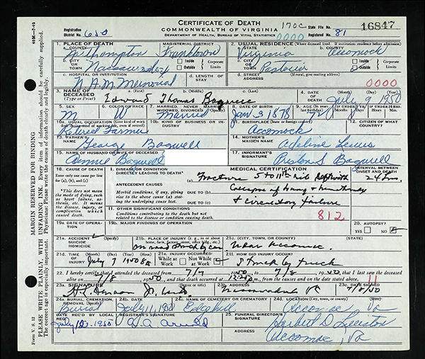 Edward Thomas Bagwell was born on 3 January 1878 in Bloxom, Virginia.1,2 He was the son of George E. Bagwell and Evelyn Caroline Lewis.1 Edward Thomas Bagwell married Annie Brown Hopkins on 28 December 1898 at Drummond Town, Virginia. Edward Thomas Bagwell died on 9 July 1950 in Nassawadox, Northampton, Virginia, at age 72.2 He was buried on 11 July 1950 at Edge Hill Cemetery, Accomac, Accomack County, Virginia.2