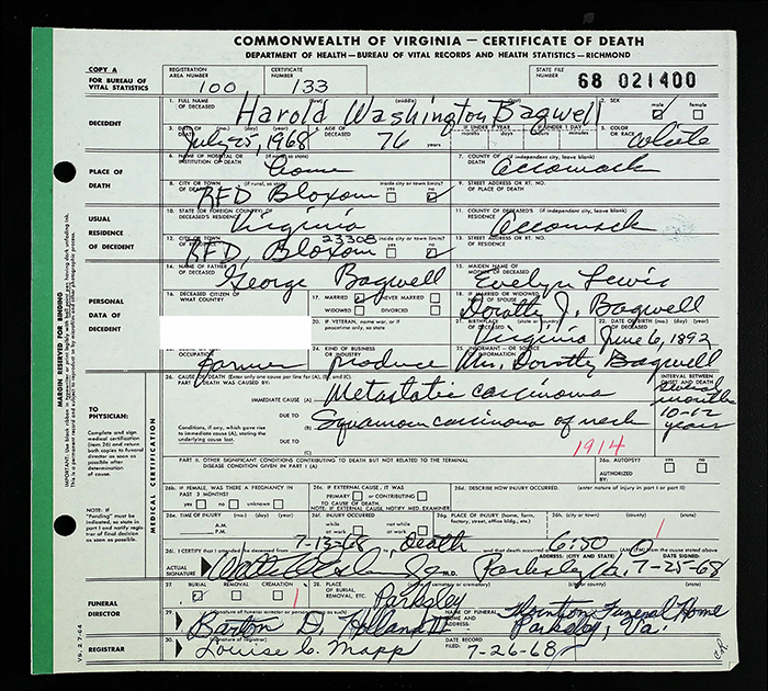Harold Washington Bagwell was born on 6 June 1892 in Accomack County, Virginia.1,2 He was the son of George E. Bagwell and Evelyn Caroline Lewis.1 Harold Washington Bagwell married Dorothy Jean Jenkins after 1920.3 Harold Washington Bagwell died on 25 July 1968 in Bloxom, Accomack County, Virginia, at age 76.2 He was buried at Parksley Cemetery, Parksley, Accomack County, Virginia.2