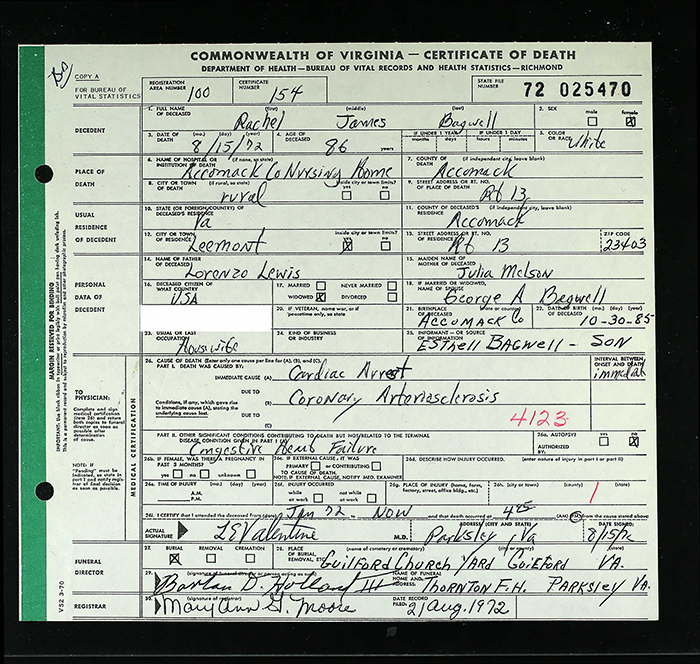 Rachel Lewis was born on 30 October 1885 in Virginia although her tombstone says she was born in 1885.1,2 As of 1 August 1909,her married name was Bagwell. She married George Augustus Bagwell, son of George E. Bagwell and Evelyn Caroline Lewis, on 1 August 1909 at Accomack County, Virginia.1 Rachel Lewis died on 15 August 1972 in LeemMont, Accomack County, Virginia, at age 86.2 She was buried at Guilford Cemetery, Guilford, Virginia.2
