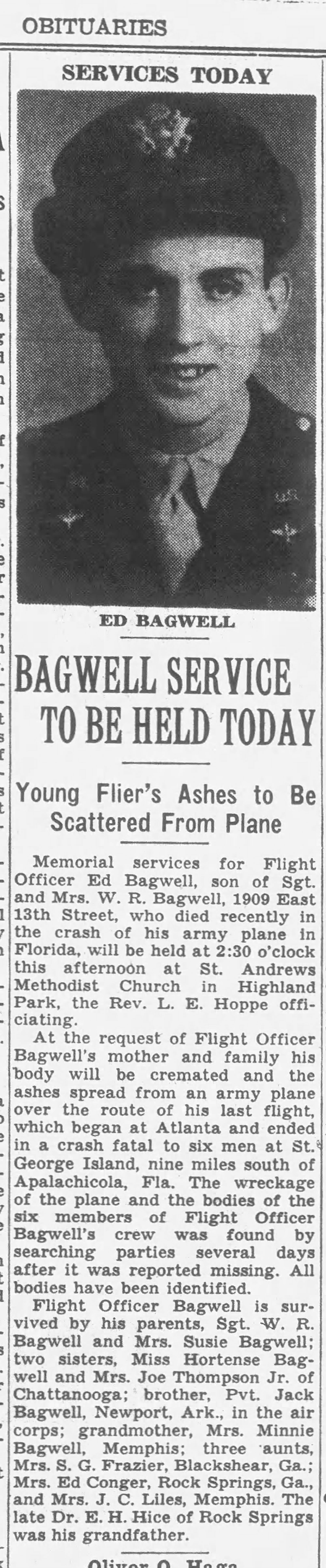 Memorial services for Flgith Officer Ed Bagwell, son of Sgt. And Mrs. W.R. Bagwell, 1909 East 13th Street, who died recently in the crash of his army plane in Florida, will be hed at St. Andrews Methodist Church in Highland Park. At the request of Fligth Officer Bagwell’s mother and family his body will be cremated and the ashed spread from an army plane over the route of his last flight, which began at Atlanta and ended in a crash fatal to six men at St. George Island, nine miles south of Apalachicola, Fla. The wrechage of the plane and the bodies of the six members of Flight Officer Bagwell’s crew was found by searching parties several days after it was reported missing. All bodies have been identified.