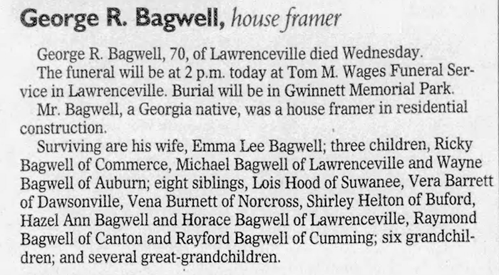 George Rayford Bagwell was born on 9 March 1927 in Georgia.1,2,3 He was the son of Reverend Rayford McCager Bagwell and Ola Mae Smith.1 George Rayford Bagwell married Emma Lee Bailey before 1950.3 George Rayford Bagwell died on 8 October 1997 in Lawrenceville, Georgia, at age 70.2 He was buried on 10 October 1997 at Gwinnett Memorial Park, Lawrenceville, Gwinnett County, Georgia.2