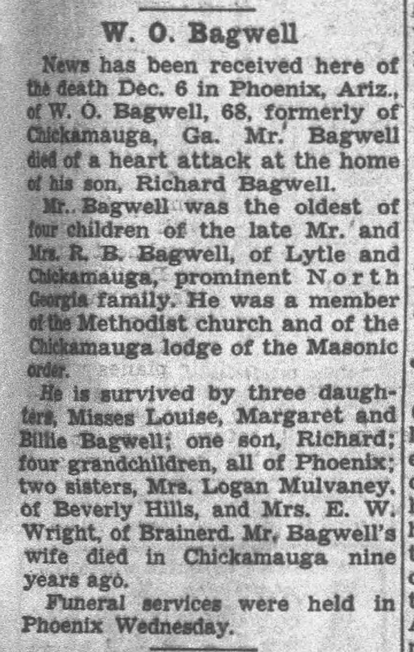 Flight Officer Bagwell is survived by his parents, Sgt. W.R. Bagwell and Mrs. Susie Bagwell; two sisters, Miss Hortense Bagwell and Mrs. Joe Thompson Jr., of Chattanooga; brother, Pvt. Jack Bagwell, Newport, Ark., in the air corps; grandmother, Mrs. Minnie Bagwell, Memphis; three aunts, Mrs. S.G. Frazier, Blackshear, Ga; Mrs. Ed Conger, Rock Springs, Ga., and Mrs. J.C. Liles, Memphis. The late Dr. E.H. Hice of Rock Springs was his grandfather.