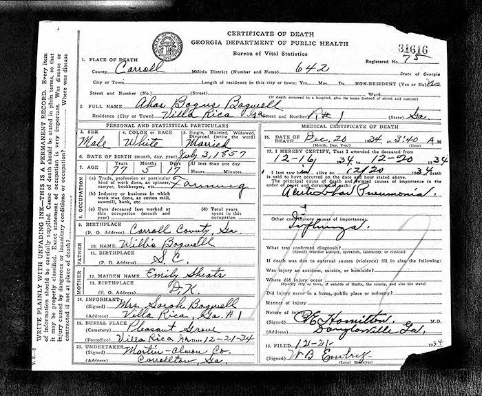 Ahaz Boggas Bagwell was also known as Ahas B. Bagwell.1 He was born on 17 May 1857 in Carroll County, Georgia.2 He was the son of Willis B. Bagwell and Emily Sheats. Ahaz Boggas Bagwell married Lenora Green, daughter of Alexander Porter Green, on 4 March 1880. Ahaz Boggas Bagwell married Sallie Jack Conner on 5 June 1894. Ahaz Boggas Bagwell died on 20 December 1934 in Villa Rica, Carroll County, Georgia, at age 77.2 He was buried on 21 December 1934 at Pleasant Grove Cemetery, Carroll County, Georgia.2