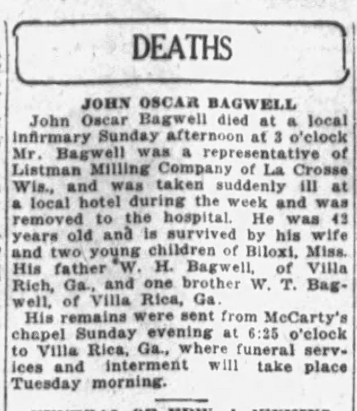 - John Oscar Bagwell+4 b. 19 Oct 1876, d. 23 Feb 1919