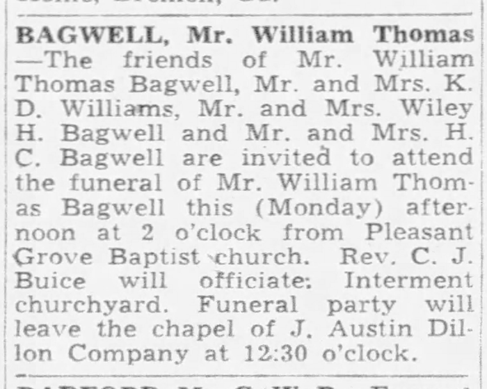 - William Thomas Bagwell+3 b. 7 Mar 1875, d. 20 Jan 1945
