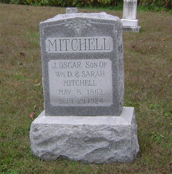 J. Oscar Mitchell was born on 8 May 1862.1 He was the son of William Durrow Mitchell and Sarah C. Bagwell.1 J. Oscar Mitchell died on 29 September 1924 at age 62.1 He was buried at Martin Cemetery, Parke County, Indiana.
