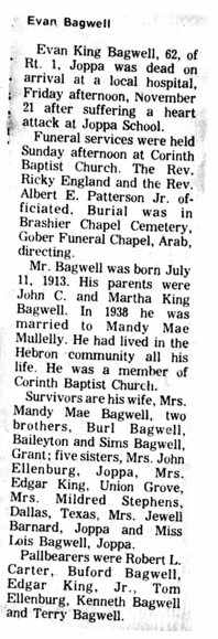Evan King Bagwell was born on 11 July 1913 in Alabama.1,2,3 He was the son of John Cicero Bagwell and Mattie Jane King.1,2 Evan King Bagwell married Mandy May Mullally.2 Evan King was a farmerand retired janitor from Redstone Arsenal in Huntsville, Alabama.2 He died on 21 November 1975 in Joppa, Cullman County, Alabama, at age 62.2,3 He was buried at Brashiers Chapel, Marshall County, Alabama.2,3