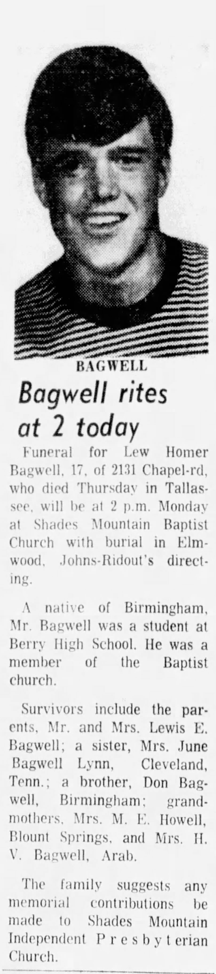 Lew Homer Bagwell was born on 17 April 1954 in Cullman, Cullman County, Alabama.1,2 He was the son of Lewis Earl Bagwell and Lucille Helen Howell.1,2 Lew Homer Bagwell died on 22 July 1971 in Lake Martin, near Tallasee, Elmore County, Alabama, at age 17 (drowned) .2 He was buried on 26 July 1971 at Elmwood Cemetery (Block 18, Lot 54), Birmingham, Jefferson County, Alabama.2