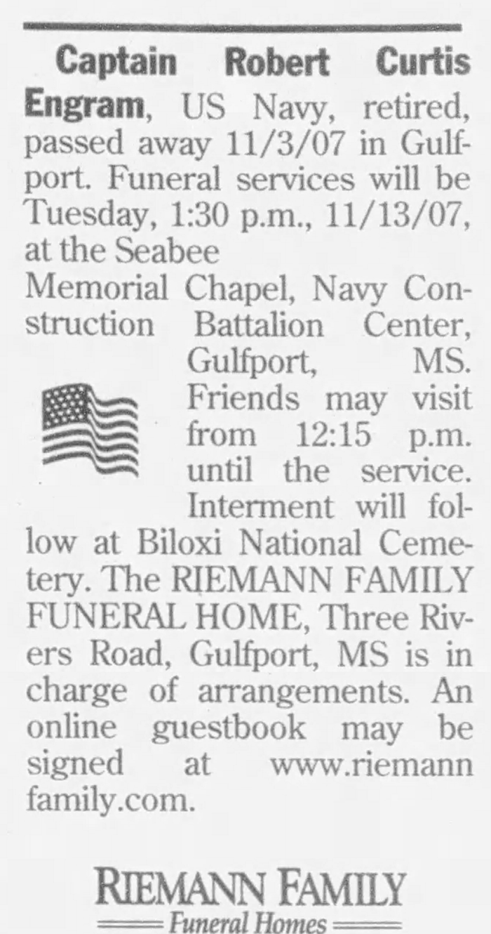 Captain Robert Curtis Engram was born on 5 January 1921 in Lake Worth, Florida.1 He was the son of John Claude Engram and Lucille Alberta Curtis. He served in the US Navy in World War II, the Korean War, and Vietnam.1 Captain Robert Curtis Engram married Carmen McCoy circa 1945. Captain Robert Curtis Engram died on 3 November 2007 in Gulfport, Harrison County, Mississippi, at age 86.1 He was buried on 13 November 2007 at Biloxi National Cemetery, Biloxi, Harrison County, Mississippi.1