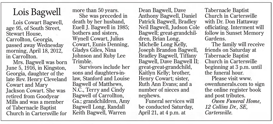 Lois Jewel Cowart was born on 5 June 1916 in Kingston, Bartow County, Georgia.1 As of 24 August 1933,her married name was Bagwell.1 She married Euell Judson Bagwell, son of Emory Judson Bagwell and Estella Townsend, on 24 August 1933 at Atco, Bartow County, Georgia.1 Lois Jewel Cowart died on 18 April 2012 in Carrollton, Georgia, at age 95.1 She was buried on 21 April 2012 at Sunset Memory Gardens, Cartersville, Bartow County, Georgia.