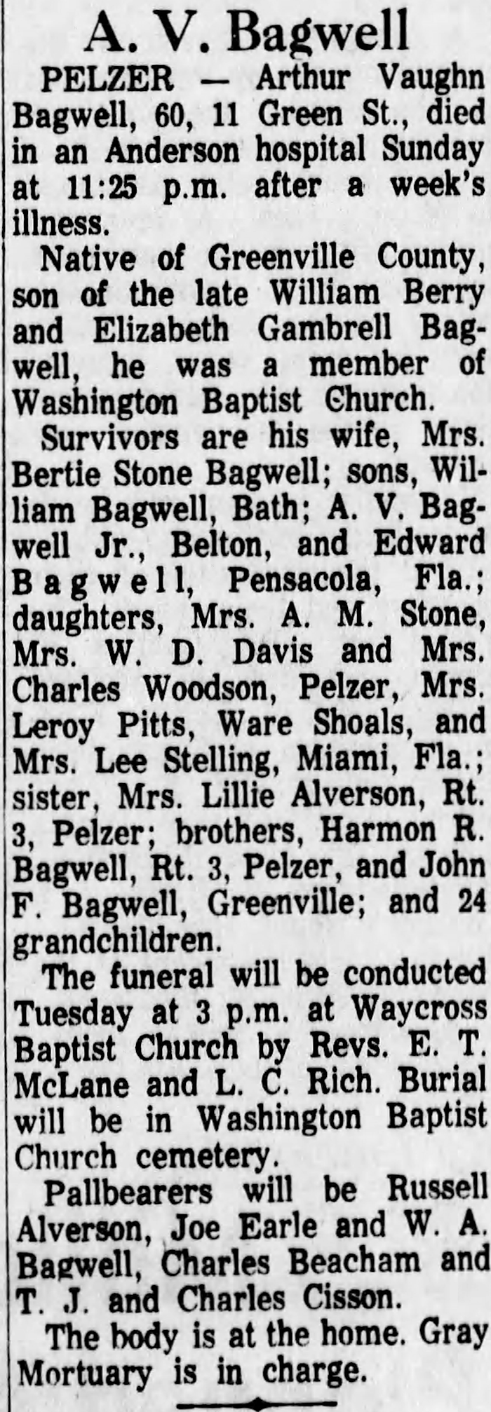 Surviving are his wife of the home; son and daughter-in-law, Tony and Shelia Ashe Bagwell of Greenville; a brother, Earl Bagwell of Pelzer; and a granddaughter, Bridgette Bagwell of Greenville.