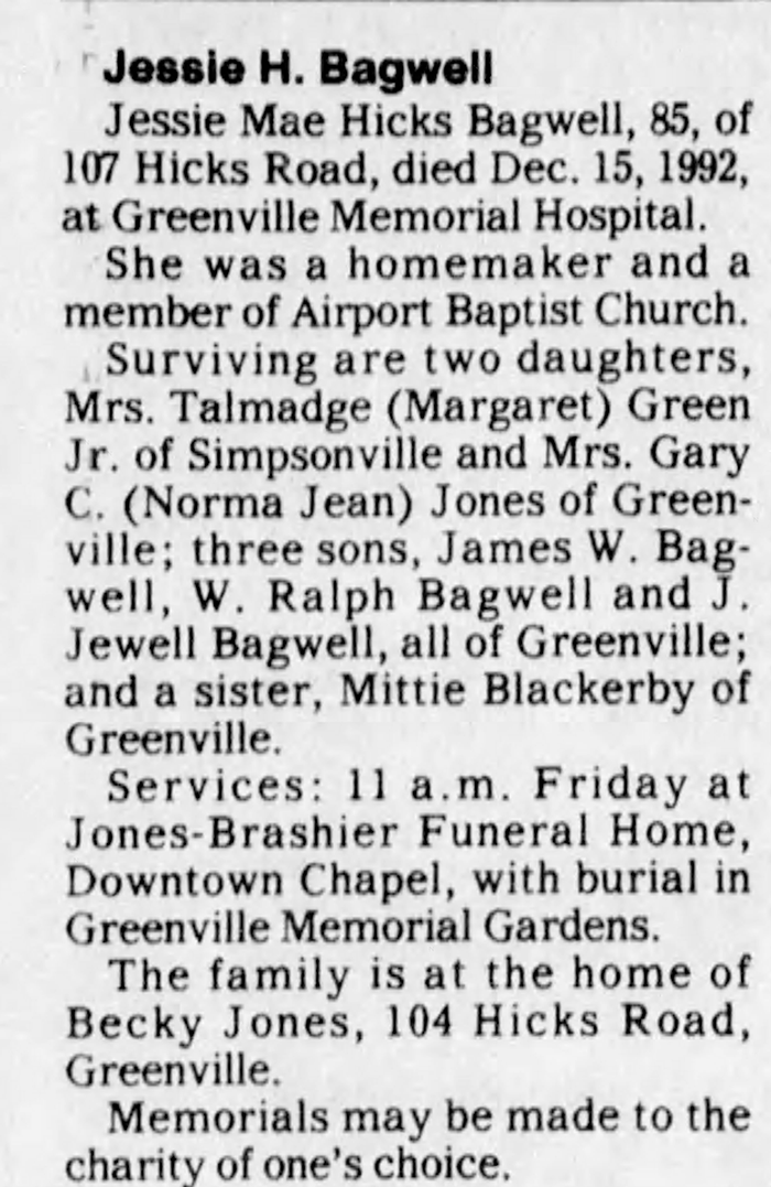 Jessie Mae Hicks was born on 26 December 1906 in Greenville County, South Carolina.1 As of 7 November 1923,her married name was Bagwell. She married Clifton Murphy Anderson Bagwell, son of Josiah Travis Bagwell and Lillie Azalea Traynham, on 7 November 1923. Jessie Mae Hicks died on 15 December 1992 in Greenville County, South Carolina, at age 85.1 She was buried at Greenville Memorial Gardens, Greenville, Greenville County, South Carolina.1
