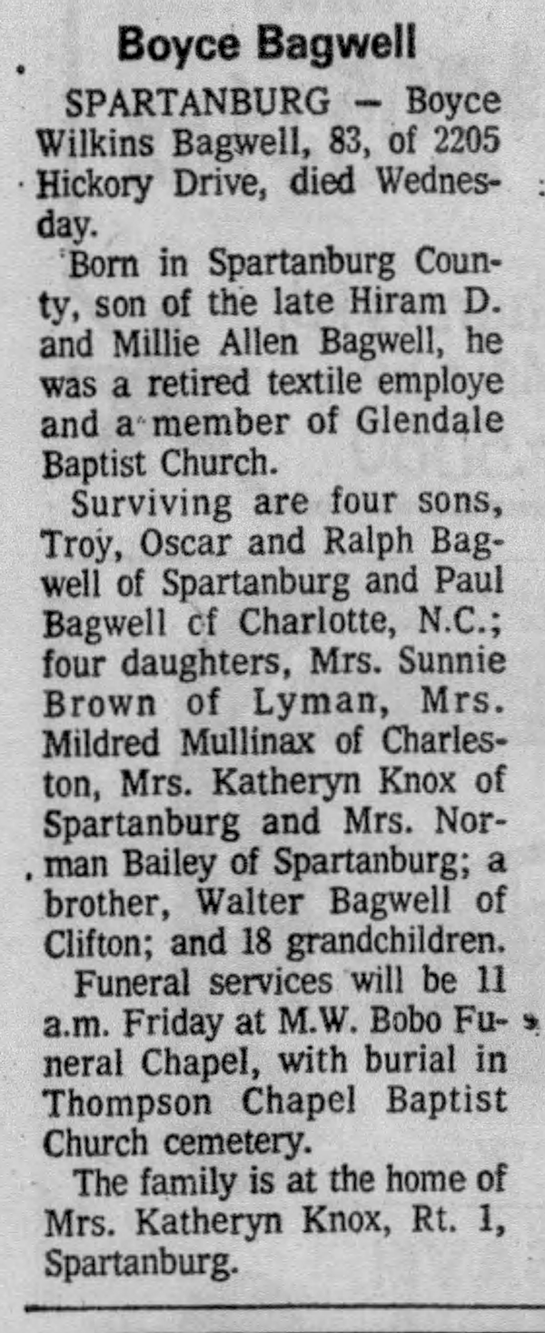 Boyce Wilkins Bagwell was born on 20 August 1891 in Clifton, South Carolina.1 He was the son of Hiram D. Bagwell and Millie Allen. Boyce Wilkins Bagwell married Hattie Kate Francis on 18 June 1911.1 Boyce Wilkins Bagwell died on 8 January 1975 in Spartanburg County, South Carolina, at age 83.1 He was buried at Thompson Chapel Cemetery, Spartanburg, Spartanburg County, South Carolina.1