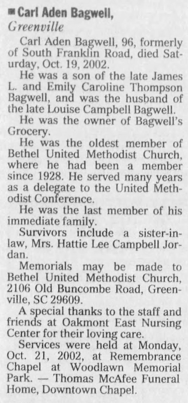Carl Aden Bagwell was born on 22 August 1906. He was the son of James Louis Bagwell and Emily Caroline Thompson. Carl Aden Bagwell died on 19 October 2002 at age 96. He was buried at Woodlawn Memorial Park, Greenville, Greenville County, South Carolina.