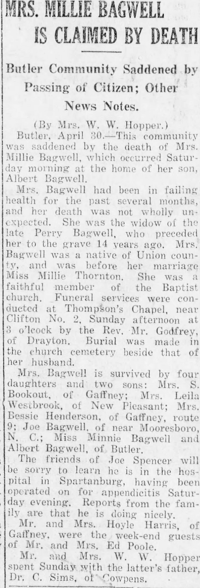 Millie Allen was born on 7 March 1852 in South Carolina. As of 1878,her married name was Bagwell. She married Hiram D. Bagwell, son of Hiram Jenkins Bagwell and Ruth Thompson, in 1878. Millie Allen died on 26 November 1941 in Clifton, Spartanburg County, South Carolina, at age 89. She was buried on 28 November 1941 at Thompson Chapel Cemetery, Spartanburg, Spartanburg County, South Carolina.