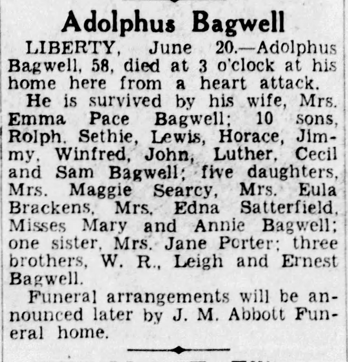 - Horace Adolphus Bagwell b. 3 Mar 1906, d. 4 Feb 1981
