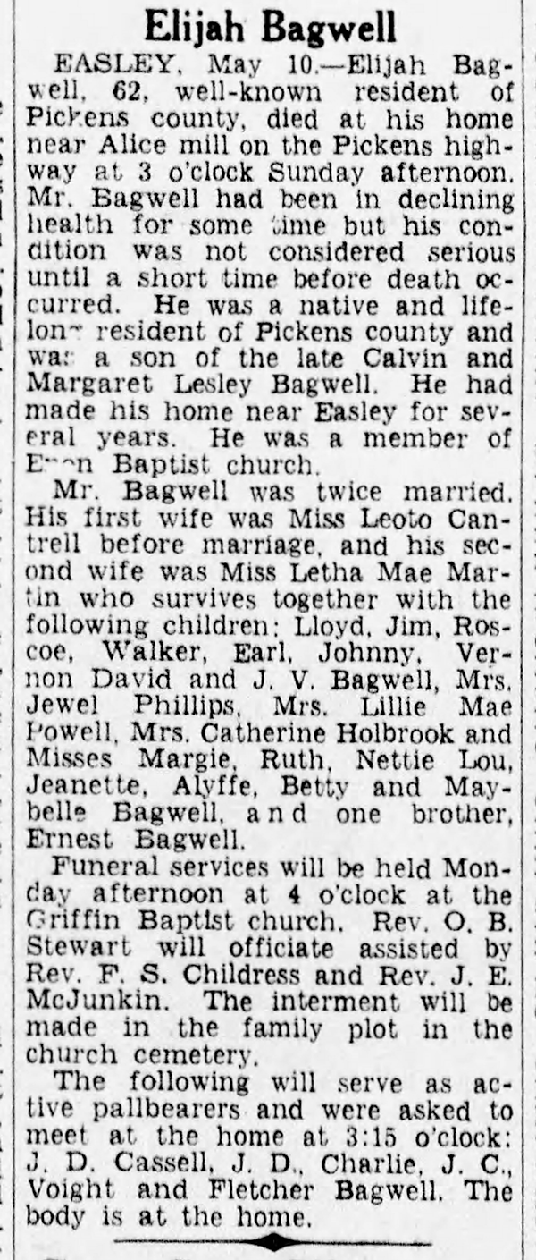 Elijah Walker Bagwell was also known as Elijah William Bagwell. He was born on 2 August 1879 in Pickens County, South Carolina.2 He was the son of Calvin Lynch Bagwell and Margaret Melissa Lesley. Elijah Walker Bagwell married Leotto Cantrell in 1899 at Pickens County, South Carolina. Elijah Walker Bagwell married Leitha Mae Martin after 1920. Elijah Walker Bagwell died on 10 May 1942 in Pickens County, South Carolina, at age 62.2 He was buried on 11 May 1942 at Griffin Baptist Church Cemetery, Pickens, Pickens County, South Carolina.2