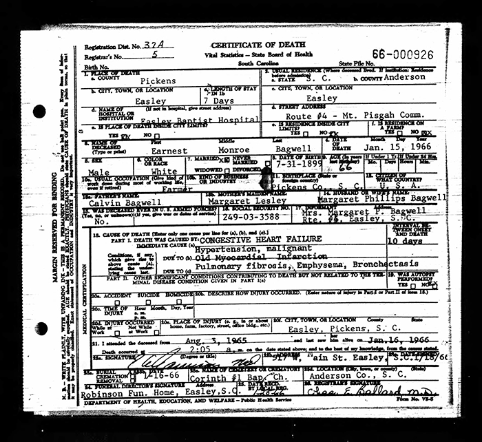 - [S7037] The Greenville News (Greenville, South Carolinia) - Obituaries: Grady Bagwell, October 15, 1976, Page: 48.
