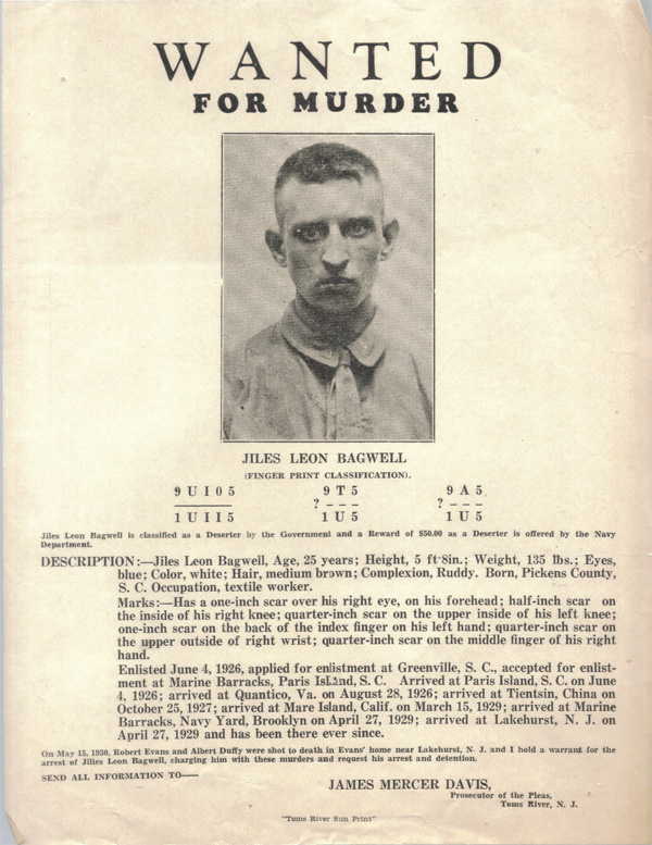 Jiles Leon Bagwell was also known as Giles Leon Bagwell. He was born on 18 March 1901 in Pickens County, South Carolina.1 He was the son of Calvin David Bagwell and Etta Lillian Hopkins. Jiles Leon Bagwell married Lucia Mae Capps on 15 March 1921 at Pickens County, South Carolina. Jiles Leon enlisted in the United States Marine Corp on 4 June 1926 at Paris Island, South Carolina.1 On 15 May 1930, Robert Evans and Albert Duffy were shot to death in Evan's home near Lakehurst, New Jersey. Jiles Leon Bagwell was charged with their murders. It is unknown at the time I am writing this whether he was found innocent or guilty or the circumstances behind the crime.1 He married Mary Wade after 1965. Jiles Leon Bagwell died in 1980. He was buried at Graceland West Cemetery and Mausoleum, Greenville, Greenville County, South Carolina.2