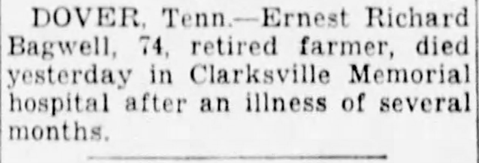 Walter N. Bagwell died in 1904 in McEwen, Humphreys County, Tennessee. He was born in 1904 in McEwen, Humphreys County, Tennessee. He was the son of Christopher Columbus Bagwell and Allie Duke.