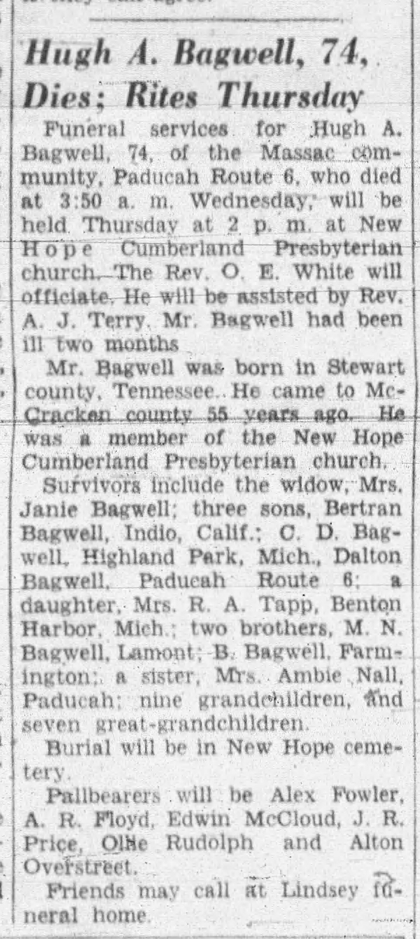 Hugh Alexander Bagwell was born on 15 November 1876 in Stewart County, Tennessee.1 He was the son of Richard Robert Bagwell and Cassandra Janes Rose. Hugh Alexander Bagwell married Janie Adcox on 5 January 1898 at Mayfield, Graves County, Kentucky. He moved to McCracken County, Kentucky. Hugh Alexander Bagwell died on 20 December 1950 in MCCracken County, Kentucky, at age 74.1 He was buried at New Hope Cemetery, Massac, MCCracken County, Kentucky.1