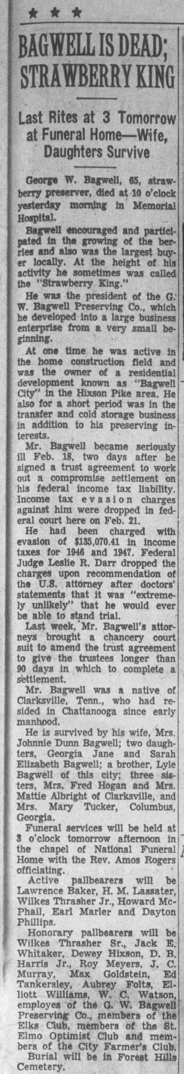 President of Bagwell Preserving Company and living at 3704 Woodmont Blvd in Nashville, Luther was 66 years old and married when he died at home of a coronary thrombosis on March 23, 1950. Burial was the next day in Woodlawn Cemetery, Nashville.